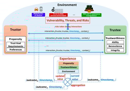 Trust is originally a foundational aspect of human social relations; and when applying trust to the SIoT environment, it should be considered under a perspective of a trustor in correlation with a society. Social interactions, subjective viewpoint of individual entity, and environments should not be neglected []. We have pointed out that besides trustworthiness of a trustee, trustor’s propensity and environmental factors such as vulnerabilities, threats and risks also contributes to the trust evaluation (Figure 1b). This is obvious because trust only occurs risky scenarios in which the trustor is going to be under vulnerability.