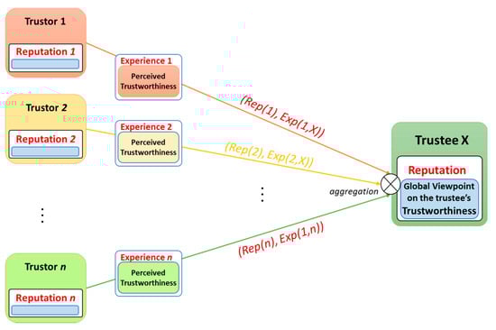 Experience and Reputation TIs are social features and attained by accumulating previous interactions among entities in the SIoT over time. Experience TI is a personal perception of the trustee’s trustworthiness by analyzing previous interactions from a specific trustor to a particular trustee in various contexts. As the personal perception, Experience TI indicates more about trustor’s propensity but not trustee’s trustworthiness and environmental factors due to limited knowledge obtained. Reputation TI, instead, reflects global perception about a trustee by aggregating all previous experiences from entities (in a society) with this trustee. Thus, Reputation TI is able to effectively exhibit about the trustee’s trustworthiness and the environment characteristics; but not about the trustor’s propensity (Figure 5). In SIoT scenarios with billions of entities, there is very high possibility that there are no prior interactions between two any entities, resulting in no Experience. Therefore, Reputation TI is a necessary indicator for trust, especially in case there are no previous interactions between a trustor and a trustee. Reputation is taken into account when evaluating trust because of the propagation characteristic of trust: Each entity (a trustor) has previous interactions with a specific entity (as the trustee) has its own opinions; and a reputation model (or a recommendation model) let it share the opinions (as its recommendations) to others. Entities, then, can refer the opinions as one of the cues of trust to personally judge trust. By doing so, trust is propagated throughout the network.