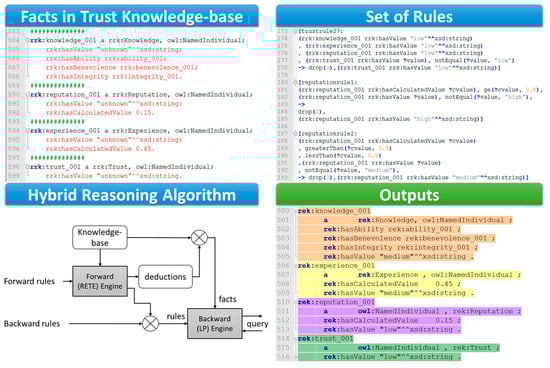 For example, we have used the Apache Jena framework in the trust demonstration for the User Recruitment in MCS use-case which integrates several types of inference engines including the generic rule-based reasoner that enables predefined rules. Before that, all TAs, Reputation TI, and Experience TI already obtained are converted into semantic information as metadata in forms of facts in Description Logics [] represented in RDFS/OWL languages (Figure 10). The Jena integrated rule-based reasoner supports both forward chaining and tabled backward chaining reasoning strategies as well as the hybrid approach. For example, a generic hybrid reasoner in the Jena framework is used in the demonstration to infer reputation values and experience values in form of levels (i.e., low, medium, and high) from the actual calculated values (the calculated values are in the range [0–1] and obtained using the proposed Experience TI model and Reputation TI model); as well as to infer the level of trust which is the overall trust value we are interested.
