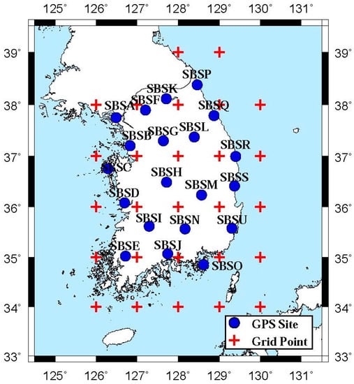 Location of 20-site PPP-RTK network in South Korea. The red crosses denote positions where gridded ionospheric and tropospheric delay corrections are generated in SSR format. The average inter-site distance is ~70 km.