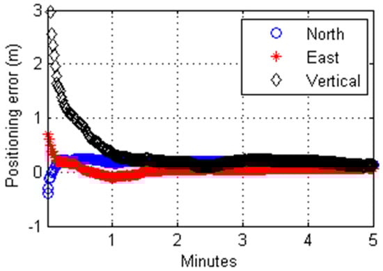 The convergence time is a critical factor in evaluating the performance of PPP processing engines. When carrier phase measurements are used, the position coordinates are stochastically estimated along with the integer ambiguities. Through this approach, the convergence times can be measured explicitly by taking the time required for ambiguity fixing. In our case, we do not estimate the integer ambiguities because only pseudorange measurements are involved. For this reason, we had to devise a new criterion for convergence.