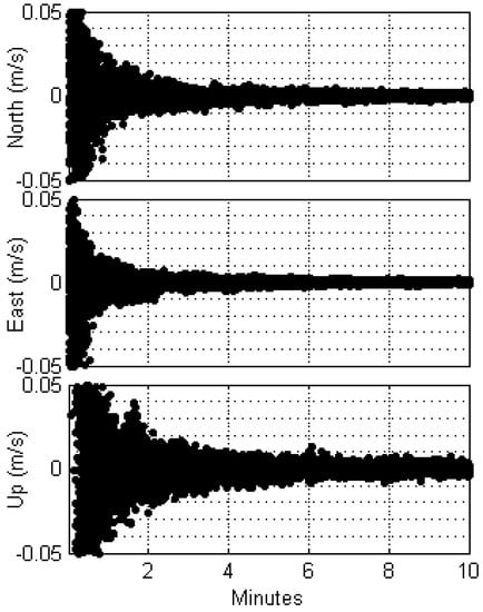 We computed the CROC values of 44 datasets in all three coordinate directions, the results of which are plotted in Figure 3, where the vertical axes have the range of ±5 cm/s. Although the CROC values oscillate significantly at the beginning, they quickly subside in the horizontal direction. In the vertical direction, however, the convergence of CROC is somewhat slow.