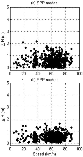 The sensitivity of the positioning accuracy with regard to the vehicle speed was analyzed in Figure 6, which shows the SPP and PPP cases. According to the figure, deviations predominantly reside within the range of 0 to 1 m. As was expected from the results in Table 2, larger scatters were observed in the SPP mode of the kinematic positioning.
