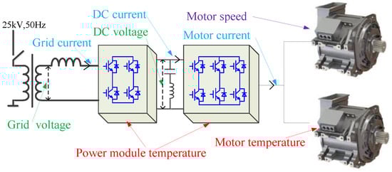 Some important information that the train traction system needs to collect is shown in Figure 1, including grid voltage and current, traction motor current and temperature, power module temperature and motor speed, and other speed-related signals [,,]. Thus, a variety of sensors are needed for sensing different signals, these commonly used sensors can be divided into four categories: current sensor, voltage sensor, speed sensor and temperature sensor. The most widely used signal sensing technologies of traction system sensors are introduced below.