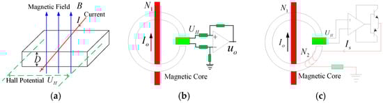 (a) Schematic diagram of the Hall-effect; (b) Schematic diagram of direct measurement by the Hall current sensor; (c) Schematic diagram of the zero-flux Hall current sensor.