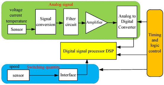 The signals obtained by means of signal sensing technology are diverse, apt to attenuation, and susceptible to interference [], therefore, acquiring and processing the sensor output signal are also important problems that must be considered. Figure 4 shows that the speed sensor output signal can be acquired and processed via a simple interface circuit; however, processing the analog signal is relatively complicated, and the signal processing requires more steps, such as analog signal processing, analog-to-digital converter (ADC) data sampling, and digital filtering processing. The technology for analog signal processing, data sampling, and digital filtering are summarized in the following section.