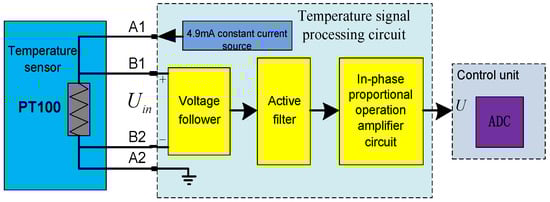 Figure 5 shows a typical signal processing circuit of traction control unit temperature sensors. Both ends of PT100 are connected to a 4.9 mA constant current source through A1 and A2. The voltage follower obtains a differential input voltage Uin through B1 and B2, and generates a low output resistance voltage signal. The output signal enters into the filter circuit and the amplifier circuit for satisfying the ADC requirement.