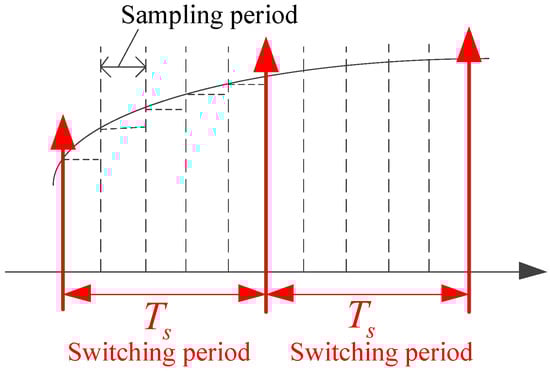 Collecting the data at discrete sampling times is necessary within digital control of the traction system. The sampling time of the analog signal must be considered. Shannon sampling theory [] shows that in order to record all information contained in a ω-bandlimited continuous signal, it suffices to record samples of the signal’s amplitude at discrete points in time, namely at the so-called Nyquist rate of 2ω samples per second. When the switching frequency is comparatively high, it can be approximately assumed that the sampling frequency needs to be twice that of the switching frequency. However, time delays gradually become apparent and therefore present a significant effect on the performance of the control system in the case of a low switching frequency. Figure 6 shows that five rounds of data acquisition are completed in one switching cycle, thereby making the control and modulation sampling time independent.