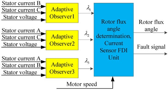 The fault diagnosis method is different between asynchronous motors and permanent magnet synchronous motors, due to their different models. In terms of an asynchronous traction motor, a full-order adaptive observer is adopted in [] to produce a residual error, and then to judge the current sensor fault according to the residual error and the given threshold value. The fault detect method can isolate the incipient fault of a speed sensor and current sensors in real-time, but the performance of the state observer is degraded at very low speed. In reference [], three Luenberger observers are used to realize a fault diagnosis of the current sensors, as shown in Figure 7. The proposed three paralleled adaptive observers are capable of current sensor fault detection and localization. An adaptive current observer that can identify the rotor resistance is proposed in [], with the estimated phase currents and rotor resistance being sent to a decision-making unit, which identifies the faulty sensor type based on a deterministic rule base. Unlike the other proposed model-based fault diagnosis systems using a bank of observers, with the proposed method, only one current observer with rotor-resistance estimation is sufficient for the isolation of all sensors faults.