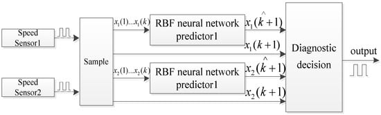 In speed sensor fault diagnosis, model-based fault diagnosis methods also rely on the motor control model. They generally judge whether a speed sensor is faulty, by comparing the observer output signal with the actual speed. The observer can be constructed through different methods, such as the extended Kalman filtering method [], the Luenberger observer [], and the model reference adaptive observer []. The estimated current no longer matches the actual value in fault condition, and this can be easily expanded to speed sensorless control. The main disadvantages of such techniques are that they are complex and dependent on systems parameters. Fault diagnosis methods of speed sensors were compared, based on the MRAS and artificial neural network in asynchronous motors, in []. It was concluded that the difference between the detection time for both algorithms was very slight. An online fault detection diagnosis method of two channel speed sensors based on the radial basis function neural network is presented in Figure 8. This method works by selecting the measured output of the speed sensor at the first k moments as the input vectors of the Radial Basis Function neural network predictor, compared to the predicted value of the speed sensor output to at the next moment, carry out fault diagnosis. The advantage of an artificial neural network is that it has parallel distribution processing ability, and can fully approximate complex nonlinear relationships. The disadvantages of neural networks are that they require a large number of parameters, and need long learning time.