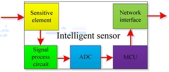 The intelligent sensor has a built-in microprocessor, and its structure is shown in Figure 9. Its working mode changes from passive measure to active measure, unlike traditional sensors. The sensor also has two technology features. The first feature is that it has data processing capacities, such as self-diagnosis, self-correction, self-learning, and self-adaption []. Its second feature is that it has a network interface [].