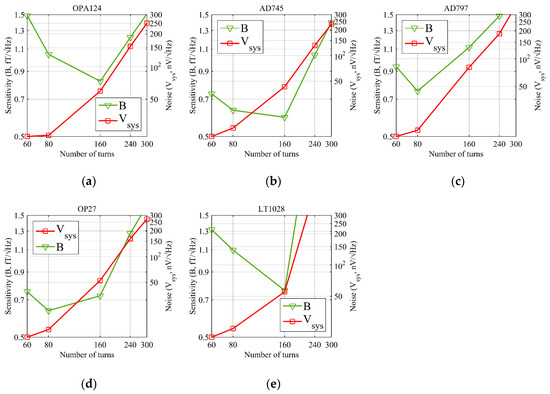 Coil sensor noise and field sensitivity with different number of turns and preamplifiers at 298 K (green curve: coil sensor sensitivity in , left Y axis; red curve: coil sensor noise in , right Y axis). (a) OPA124; (b) AD745; (c) AD797; (d) OP27; (e) LT1028.