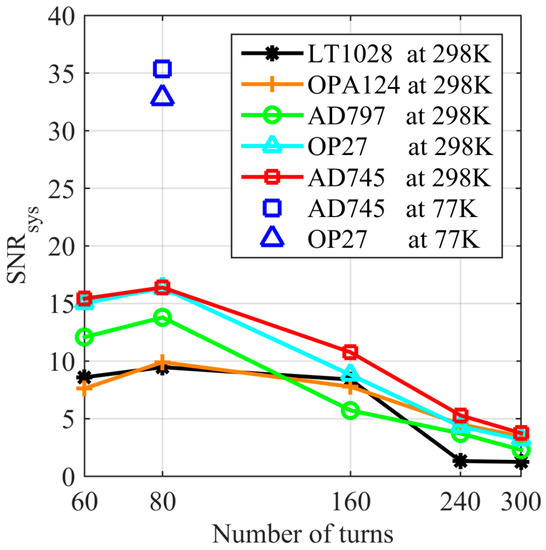 In summary, the SNR of the coil sensor is shown in Figure 3. It illustrates that the AD745 and OP27 preamplifiers have similar SNR of about 16 when the coil has 80-turn, which significantly exceeds the SNR of 11 when the coil has 160-turn. In Figure 3, the AD745 preamplifier has similar values when the number of turns are 160 or 80. Additionally, when the number of turns is 80, the SNR is significantly higher than when the number of turns is 160. Therefore, the number of turns is set to 80. At 77 K, AD745 and OP27 also have the similar SNR, 35 and 33, respectively. Thus, AD745 or OP27 can be selected as the preamplifier when the coil sensor has a number of turns equal to 80.