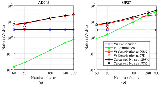 After the 80-turn coil is immersed in liquid nitrogen, the temperature stabilizes at 77 K. The calculated under this condition, is shown as the red triangle in Figure 4, and the overall noise is shown as the black triangle in Figure 4. The decreases by half, which is close to the of AD745 and OP27. However, the of OP27 greatly exceeds the noise of AD745 and is the dominant component in the overall noise. Therefore, considering the two scenarios of 298 K and 77 K, AD745 is selected as the preamplifier.