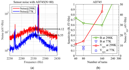 System noise and field sensitivity of the coil sensor at 298 K and 77 K. (a) noise of the coil sensor with AD745 (the number of turns is 80, center frequency is 2330 Hz, the noise is 14.12 at 298 K and 6.55 at 77 K, both measured in the EMSR, there are two interferences of harmonic, 2250 Hz and 2350 Hz, respectively); (b) field sensitivity of the coil sensor with AD745 (green curve: field sensitivity in at 298 K, left Y axis; red curve: noise in at 298 K, right Y axis, blue triangle: field sensitivity at 77 K, blue square: noise at 77 K).