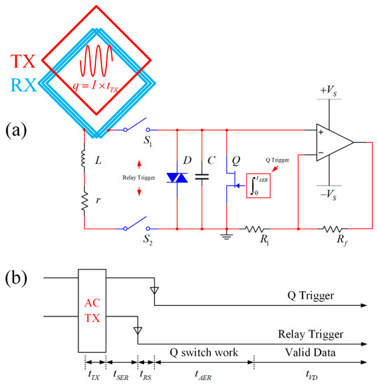 The time sequence in Figure 6b shows that the AC transmitter signal duration is . At this moment, the high voltage relays and in the receiving circuit are open circuits to prevent the Lenz law effect in the Rx from causing damage in the receiver because of the transmitter coupling. After the transmitter switches off, during a period of time , the transmitting coil and Rx undergo a self-energy reduction process to deplete the transmitter induced energy. When the relay trigger receives the falling edge, the high voltage relays and attract each other, and the Rx and preamplifier form an electrically closed circuit. Because the and attraction process fluctuates, the duration of this process is defined as time of the relay switch (). Additionally, the switching process will generate an excitation in the receiving circuit and cause ringing. When the Q trigger falling edge is applied, the Q-switch circuit begins to operate. The integrator changes the FET (BF246B, Fairchild Semiconductor International, Inc., Phoenix, AZ, USA) gate voltage linearly from 0 V to −6.5 V, and the drain-source DC resistance changes linearly from 26 Ω to nearly 20 MΩ. The integration period is , during which the ringing energy is depleted via the ascending linear transformation of the FET drain-source resistance. This period of time is also called the circuit auxiliary energy reduction process. After the FET reaches a high resistive stable state, the collected data are valid, and the recording time of valid data () starts.