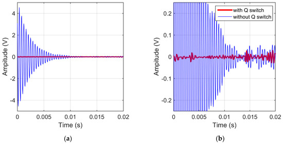 In the MRS detection system, the Tx coincides with the Rx. During the transmitter period, a relatively strong induction electromotive force couples to the Rx. To prevent the signal receiving circuit from being damaged by the high voltage, a high voltage relay and a bi-directional parallel protection diode are added before the preamplifier. In order to quickly deplete the transmitter coupling energy and to suppress ringing in the receiving circuit, a Q-switch circuit is used [34], as shown in Figure 6a.