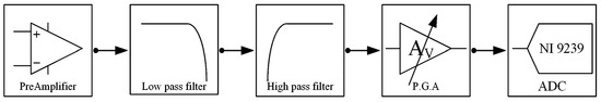 As shown in Figure 8, an active 8-order Butterworth low-pass filter and an active 8-order Butterworth high-pass filter are cascaded to form a band-pass filter after the preamplifier. The operational amplifier is an LT1885, and the cut-off frequency is from 1.3 to 3.7 kHz. The selection of this frequency is based on the Larmor frequency range that corresponds to the global geomagnetic field.