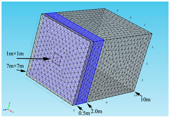 MRS forward model. COMSOL software is used to generate mesh and calculate magnetic field, and then MRS signal is calculated by Equation (6). The surface of cube is the boundary of the magnetic field and the blue layer represents the aquifer.