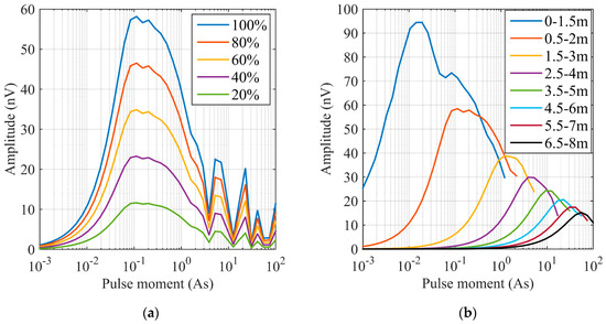Using Equations (5) and (6), as well as the coil sensor parameters, two aquifer models in tunnel and mine are established to simulate the MRS signal. For the first model, the coil is one-meter-side, single-turn and 80-turn for Tx coil and Rx coil, respectively. The Larmor frequency is 2330 Hz. The inclination angle of the Earth magnetic field is 60 degrees. The pulse moment is in range of 0.001–1 As. For the aquifer model, the front surface is located at 0.5 m behind the coil and the thickness is 1.5 m, as shown in Figure 9, which is similar to the field test, but in the orthogonal direction. By changing the water content from 100% to 20%, the amplitude of the MRS signal reduces proportionally as shown in Figure 10a.