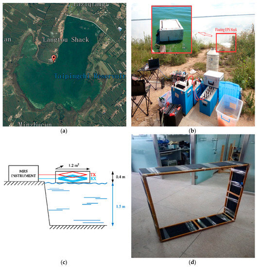 Field location and scenario. (a) Satellite map; (b) floating coil sensor and instrument; (c) schematic diagram for measurement; (d) rigid 1 m coil.