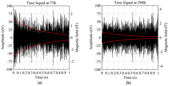 A comparison of these results shows that the MRS signal at 77 K is stronger than that at 298 K and a weak attenuation trend can already be observed in the time domain. In comparison, at 298 K, the attenuation trend is basically submerged in the noise. The minimum fitted values of the magnetic field in Figure 12a,b are 0.46 fT and 0.90 fT, respectively, which means that the CCS is more sensitive to the magnetic field. This conversion of the MRS signal to the magnetic field is based on Equation (2). In the frequency domain, the peak significantly exceeds the noise at the Larmor frequency, while at 298 K, the MRS signal peak is moderate and a noise interference frequency (2317 Hz) accounts for the primary component. Signal processing is divided into three steps: first, to reduce the noise interference; next, to transform the MRS signal with the Hilbert method and obtain the envelope curve, as shown in the red curve in Figure 12; and at last, to extract the signal parameters using a non-linear fitting method [39]. Then, the four key parameters, , , and of the MRS signal in Equation (6) are estimated, as well as the confidences are list in Table 2.