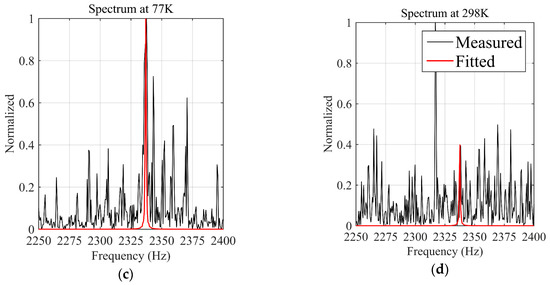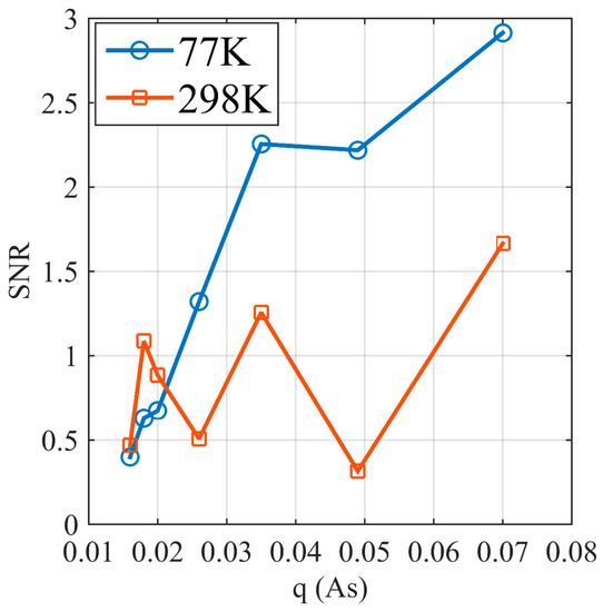 The coil sensor noise at 298 K is measured as 14.12 and 6.55 at 77 K in the EMSR as shown in Figure 5a. The value is 0.63 at 298 K and 0.17 at 77 K, as shown in Figure 5b.