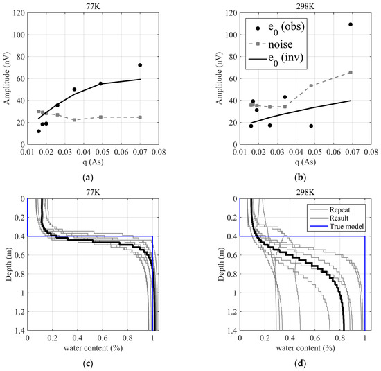 For inverting the aquifer model, the initial amplitudes at the seven pulse moments at 298 K and 77 K are extracted and shown in the black circles in Figure 13a,b. Additionally, the noise level of each pulse moment is estimated, as shown in the gray squares in Figure 13. A comparison of and noise shows that the SNR at 77 K significantly exceeds the SNR at 298 K. At 77 K, except for a few small signal amplitudes at the small pulse moments, at the other pulse moments always exceeds the noise level and gradually increases. At 298 K, only three scenarios have that exceeds the noise level. The increasing trend of versus the pulse moment is unstable and has multiple fluctuations. A depth profile of the underground water is obtained using the initial amplitude inversion method [40], as shown in Figure 13c,d, where the black curves are the inversion results of the measured data , the ten gray curves are the results of repeated inversions at each noise level and the blue curves are the true model from the known condition of the test site. The simulation curve of the initial amplitude that represents the fit with the measured data is calculated from the inversion result, as shown by the black solid lines in Figure 13a,b. Figure 13 shows that at 77 K, the inversion result matches the true model at the test site, i.e., 0–0.4 m is the distance of the Tx from the water surface, and below 0.4 m, there is a pure bulk water with 100% water content. The measured data is inverted using an open program, MRSMatlab (Leibniz Institute for Applied Geophysics, Hannover, Germany) [41].