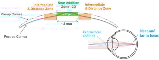 Even though various approaches—based on diverse technologies and methodologies—for the treatment of age-related far or nearsightedness have been proposed and documented in literature, effective presbyopia treatment remains a challenge in modern eye care. State-of-the-art treatment involves the implantation of multifocal intraocular lenses [,], which by nature is a highly invasive surgical procedure, and postoperative refraction planning remains highly complex. Other approaches such as mono-vision corneal procedures [,] use excimer lasers and LASIK to treat presbyopia, but these methods are unfortunately not well tolerated by many subjects. Corneal inlay implantation [,], intrastromal femtosecond laser corrections [], or other excimer laser-based presbyopia treatments [] have been used in clinics with some success over the last few years.