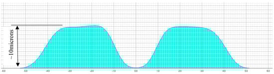 Typical multifocal ablation profile of a combined myopic and presbyopic treatment. The schematic indicates the amount of ablated tissue (blue area), with respect to the distance from the center of the cornea. Such a profile corrects the subjects’ nearsightedness, as well as creates a steep central zone of 3 mm, providing extra refractive power for near-vision.