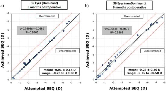 Attempted versus achieved spherical equivalent (SEQ) of (a) dominant and (b) non-dominant eyes, six months postoperatively. The regression lines in each graph indicate a small undercorrection for low values and a slight overcorrection for high values of spherical equivalent. SEQ: spherical equivalent; D: unit of refractive power, diopters.
