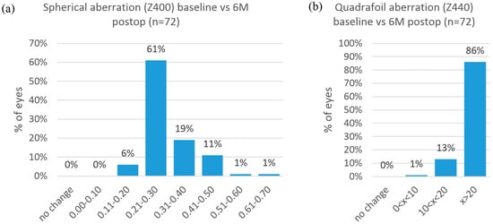 Surgically induced spherical (a) and quadrafoil (b) aberrations in micrometers, compared preoperatively (baseline) to postoperatively (postop). The treatment induced 0.21 to 0.40 microns of spherical aberration (Z400) and more than 20 microns of quadrafoil aberration (Z440) in most eyes.