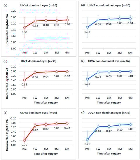 Mean and standard deviation of monocular uncorrected visual acuity for near (UNVA), intermediate (UIVA), and distance vision (UDVA) for 36 dominant (a–c) (shown in red), and 36 non-dominant (d–f) (shown in blue) eyes. Values are given preoperatively, and at one week (1 W), one month (1 M), three months (3 M), and six months (6 M) postsurgical follow-up.