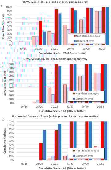 Cumulative percentage of subjects with 20/x dominant and non-dominant near (a), intermediate (b), and distance (c) visual acuity for 36 subjects. Dashed bars are preoperative, and solid bars are six-months postoperative data. Each percentage value is to be interpreted as 20/x vision or better.