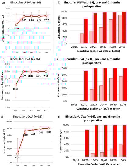 (a–c) Mean and standard deviation of binocular uncorrected visual acuity UNVA, UIVA, and UDVA vision for 36 subjects. Values are given preoperatively, and at one week (1 W), one month (1 M), three months (3 M), and six months (6 M) postsurgical follow-up. (d–f) Cumulative percentage of subjects with 20/x binocular near (UDVA), intermediate (UIVA), and distance (UDVA) vision for 36 subjects. Each percentage value is to be interpreted as 20/x vision or better.