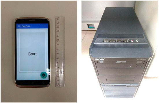 The proposed system consists of smartphone and server side. The smartphone side consists of a smartphone equipped with a back camera and a network module. This study used the Infocus M320 smartphone (M320, Infocus, Tigard, OR, USA) for development and testing. For the specification of the smartphone, the width and length of the smartphone are 77.4 mm and 150.5 mm respectively. The weight of the smartphone is 191 g. For the battery aspect, the capacity is 3100 mAh. On the other hand, the specification of server hardware is a personal computer (Veriton M2611G, Acer Inc., New Taipei City, Taiwan) which is equipped with central processing unit (CPU) Intel Core i7-3370 3.4 GHz, 8 GB DRAM, and a graphics processing unit (GPU) (GT640-2GD3, ASUS Inc., Taipei, Taiwan) that can run Compute Unified Device Architecture (CUDA) to execute deep computing. Figure 1 shows the photograph of the smartphone and server.