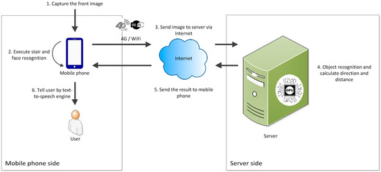 This section introduces the aforementioned software modules. The software design of our proposed system involves the feature recognition, deep recognition, and direction and distance modules. The feature recognition module was developed using Java and OpenCV 3.0.0, and installed in a smartphone in this study. This module provides face and stair recognition. The other two modules are executed by the server operated by an Ubuntu 14.04 Linux operating system. The deep recognition module was developed using C and the Caffe deep learning framework and accelerated using CUDA 7.5 (NVIDIA Corp., Santa Clara, CA, USA). The direction and distance module was written in Python language. The three recognition modules are described in the following subsections.