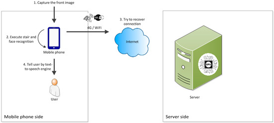 When a user passes through an underpass or area with poor signal coverage, the smartphone’s connection program automatically disconnects and switches to offline mode. In this mode, the smartphone still captures images of the scene in front of the user continuously and sends them to the feature recognition module on the smartphone. After recognition, the smartphone directly provides the results to the user. The smartphone simultaneously continues attempting to connect to the backend server. The smartphone switches to online mode after successfully connecting to the server. Figure 4 shows the offline mode working processes.