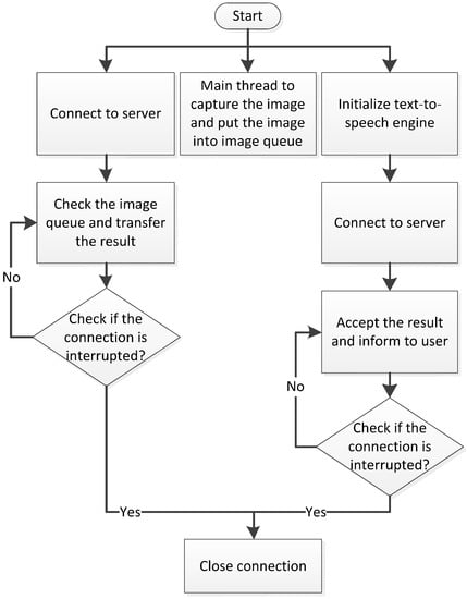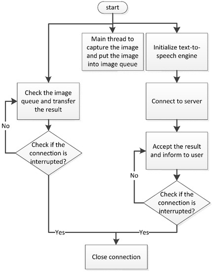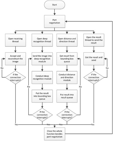 Figure 8 shows the operating process of software on the server side. After the program has been launched, the server continues to supervise the connection request from the remote smartphone. After the connection request is received, the smartphone performs port negotiation with the server to determine the working connection port number. After the negotiation is completed, the server launches four threads that receive images transmitted from the smartphone, run the deep recognition module, run the direction and distance modules, and transmit the recognition results. When the connection is interrupted, the server closes these four threads, maintaining only the port negotiation thread to wait for a connection to be made by the next user.