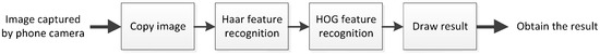 After a smartphone has captured a frontal image, the image is sent to the feature recognition module. First, the smartphone reproduces the image. If the smartphone is in online mode, the original image is sent to the remote server. If the smartphone is in offline mode, the original image is not sent anywhere. Subsequently, the module processes the reproduced image to detect stairs through the Haar feature classifier and recognize human faces through the HOG-trained classifier. Eventually, the smartphone constructs a recognition result on the clone image. The procedure is shown in Figure 10.