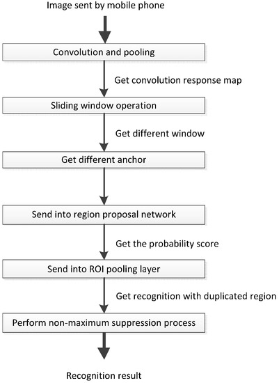 In the stable mode, when the receiving thread receives an image sent from a smartphone, the image is transmitted to the deep recognition module that is based on the Faster R-CNN algorithm. After the image has been received, it is sent to the CNN model to obtain its convolutional response map. Subsequently, the deep recognition module applies sliding window scanning to the image’s convolutional response map to determine windows and anchors of various sizes and scales. Next, the module places every anchor into an area classify layer to obtain their values, thereby determining whether the candidate area is the target object. A coordinate-responded convolutional response graph is sent to a region of interest pooling layer. Finally, the non-maximum suppression algorithm is run to determine the recognized object type and its coordinates. This process is shown in Figure 11.