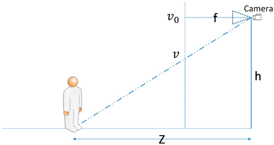 We referred to the method of Davison et al. [31] to calculate an object’s approximate distance from a user. The concept is illustrated in Figure 12, where . is the camera focus, is the pixel density (pixel/meter), is the camera height from the ground, is the center coordinate of the formed image, is the target object connected to the ground coordinate, and is the distance between the target object and camera. Equation (1) is the formula for distance calculation: