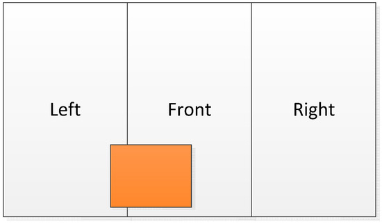 The module’s directional recognition function splits the image into three equally sized left, middle, and right segments. This module detects the specific segment where the object’s center coordinate is located and then outputs the corresponding segment. Figure 13 shows a direction schematic, where the central point of the orange object is in the middle segment of the image. Under such circumstances, our system notifies the user of an obstacle in front of him or her.