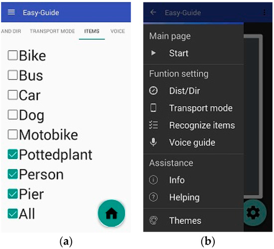 Snapshots of Android program: (a) settings page for obstacle type selection; (b) settings options with black background and white words.