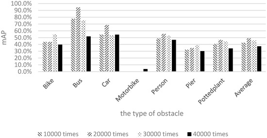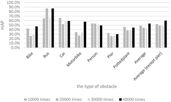 This study adopted mean average precision (mAP) to evaluate the effectiveness of depth learning. Additional 800 images captured in and around campus were used for testing. We conducted the training process 10,000, 20,000, 30,000, and 40,000 times to evaluate the differences in the mAP values. Figure 15 shows the results of using only Pascal images for training.