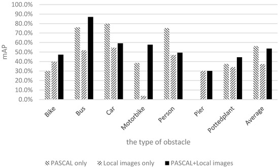 Figure 18 shows the comparison of the recognition effects associated with the three datasets after 40,000 training iterations. As shown in Figure 18, although the mAP of the mixed images was slightly lower than that of the Pascal images, it was within a permissible range. The Pascal mAP was the highest because the pier class was excluded. However, the recognition of piers is crucial for visually impaired people. Therefore, the combination of mixed images along with 40,000 training iterations could more closely meet user needs. Retraining helps to increase the effectiveness of recognition and achieve our goal.
