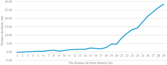 Figure 19 shows the deviation between the calculated distance and actual distance. The vertical axis is the distance deviation and the horizontal axis is the distance from the user to the obstacle. In the experiment, deviations were recorded for each time the user walked back 1 m. Subsequently, the deviations were plotted on a line graph with meters as the unit of measurement. Figure 19 indicates a distance of 10 m to be a practical limitation in this study. If the actual distance is more than 10 m, the deviation would increase significantly, and if the actual distance is less than 10 m, the average deviation is within 10%. We divided the distance into far, medium, and near. Therefore, under a valid recognition distance, if the average deviation is within 10%, the system has already reached the effects of judging the distance.