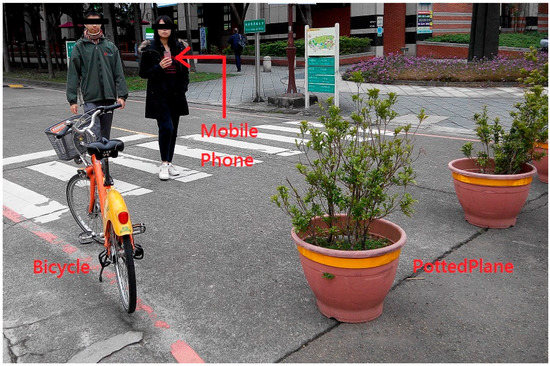 To meet various user needs to a sufficient extent, according to the answers obtained from the interviews with visually impaired people, this system is designed to recognize seven common obstacle types. In this study, the system was trained using an Internet model that had been trained by an image dataset called ImageNet [32]. We intend to train the system again using images in Pascal [33]; however, Pascal has the following three drawbacks. First, piers are not present among the 20 image categories in Pascal. Second, although images in Pascal were collected from various locations worldwide, none have been captured from experimental environments such as the ones used in this study. Third, the images in Pascal were captured using high-resolution cameras, whereas the images recognized by the system in this study are captured using smartphones. The difference in scale between images captured using a high-resolution camera and those captured using a smartphone would influence the recognition results. To overcome these drawbacks, images captured by ourselves were used in this study to train the classifier, thereby enabling the training model to be closer to a real situation. Therefore, 1710 images were taken in and around the campus, and each obstacle in these images was labeled with its location and type.