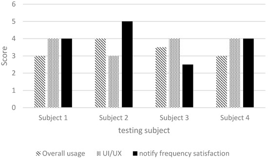 In addition to on-site testing, we designed a simple questionnaire for users to provide feedback. Each questionnaire item was to be scored from 1 to 5 points, with 1 point representing the lowest possible score. The following items were included: (1) overall impression; (2) user interface and user experience; and (3) alert frequency. The results are shown in Figure 21, indicating that the scores were mostly higher than 3 points (Figure 21), thereby verifying the high effectiveness of our system in assisting visually impaired people. The alert frequency also met user expectations.