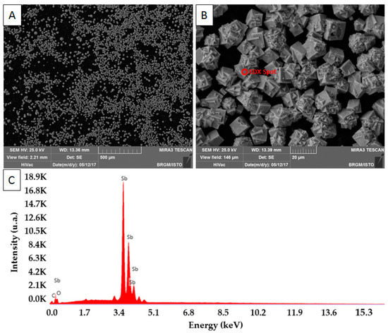 We used a monocrystalline antimony (99.999%, m = 500 mg and d = 6.7) electrode without any pre-treatment or treatment over 16 months, in order to investigate its long-term robustness for pH monitoring. Carbon-based screen-printed electrodes (SPEs) [34,38,40,54], with a working surface of 9.6 mm2, were conditioned in a stirred solution containing Sb(III) (10−2 M SbCl3) and HNO3 (pH = 0) by applying four cycles of cyclic voltammetry (potential range −0.1 V to +0.8 V, scan rate 100 mVs−1). The Sb crystals (Sb3+ + 3e− → Sb) were then deposited at −0.5 V/SCE during 1600 s. These two steps were performed without removing oxygen from the solution. Figure 1 shows surface analyses carried out by scanning electron microscopy coupled to energy dispersive X-ray (SEM/EDX) on a freshly antimony-coated SPE. Experiments were performed using a TESCAN MIRA XMU scanning electron microscope (TESCAN ORSAY FRANCE, Fuveau, France). Figure 1A exhibits a representative picture of the working surface. Approximately 80% of its surface is coated with antimony. As shown on Figure 1B, shape and size (≈13 µm) of grains are homogeneous. The EDX spectrum presented on Figure 1C demonstrates the attainment of a composite material consisting in Sb-coated SPE.